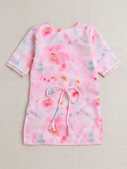 All Over Printed Elbo Sleeves Gathered Top With Afhgani Pants For Girls-Pink