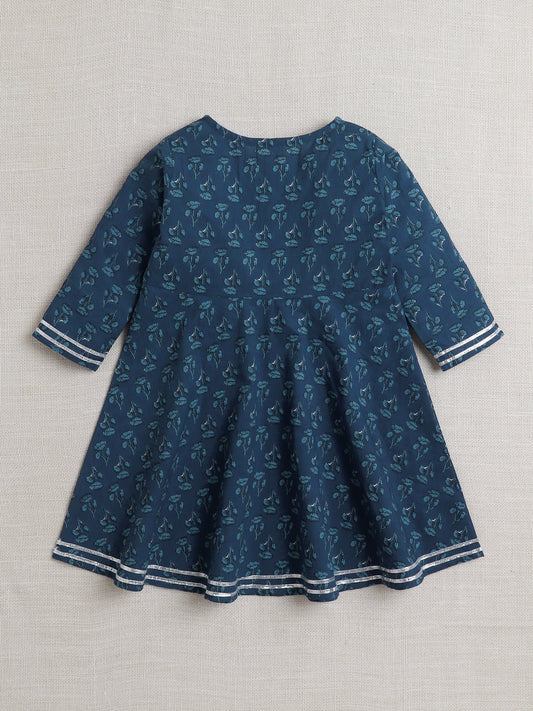 All Over Printed Lace Embellished Sleeveless Cotton Dress-Navy Blue