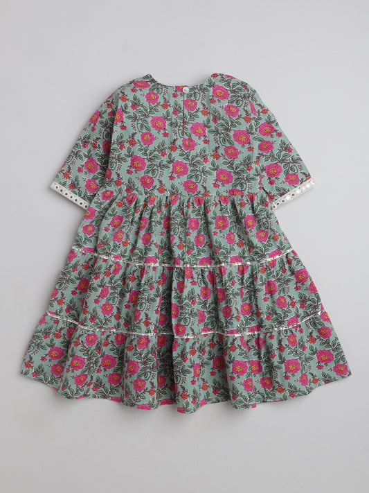 Printed Short Sleeves Aabla Lace & Tassle Detailing Tiered Gota Dress For Girls-Mint