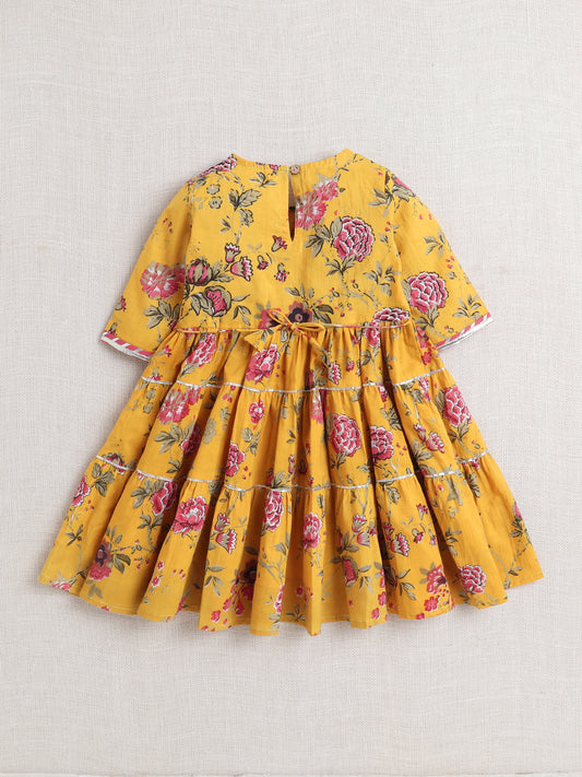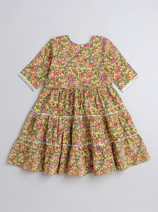 Printed Elbow Sleeves Aabla Lace & Tassle Detailing Tiered Gota Dress For Girls-Yellow