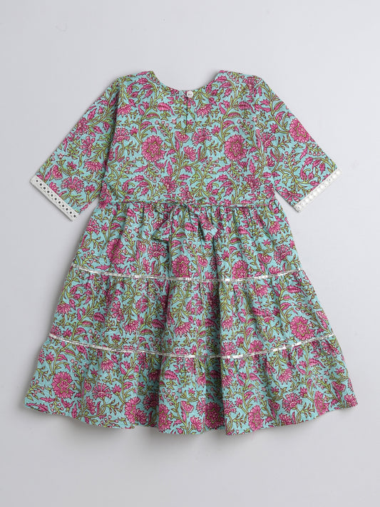 Printed Elbow Sleeves Magji Lace & Tassle Detailing Tiered Gota Dress For Girls-Blue