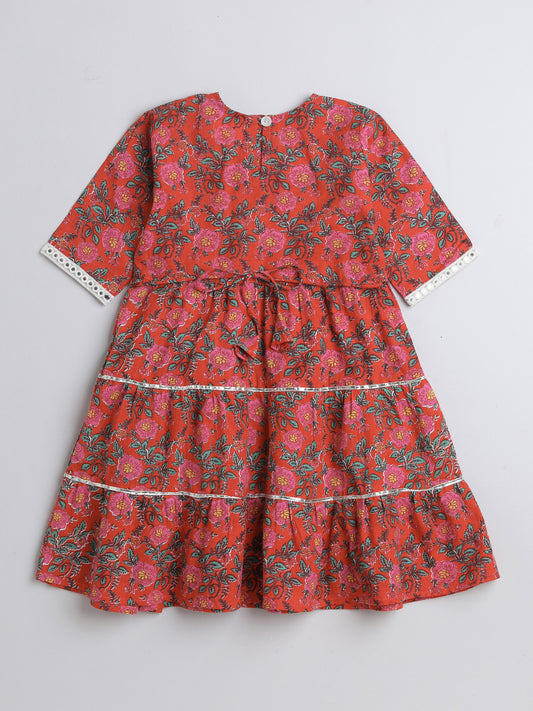Printed Elbow Sleeves Aabla Lace & Tassle Detailing Tiered Gota Dress For Girls-Red