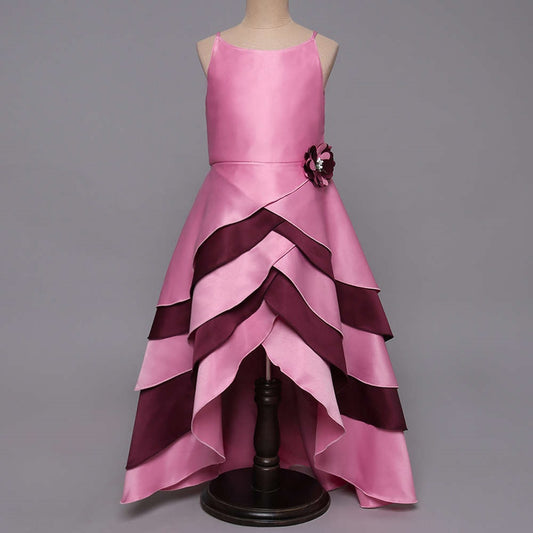 Sleeveless Floral Applique Detail Multi Layered High Low Gown Pink