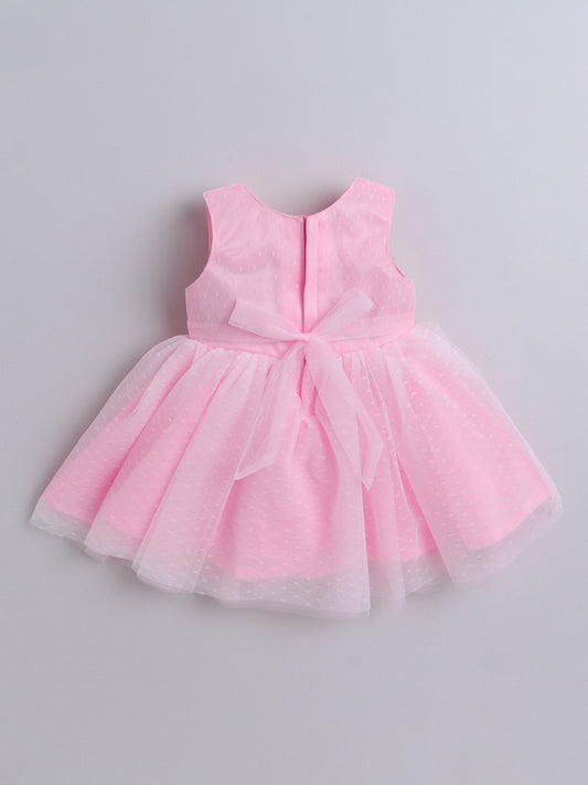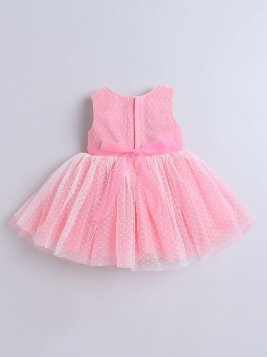Sleeveless Dots Embroidered & Flower Applique Detailed Net Dress - Pink
