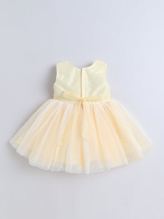 Sleeveless Dots Embroidered & Flower Applique Detailed Net Dress - Yellow