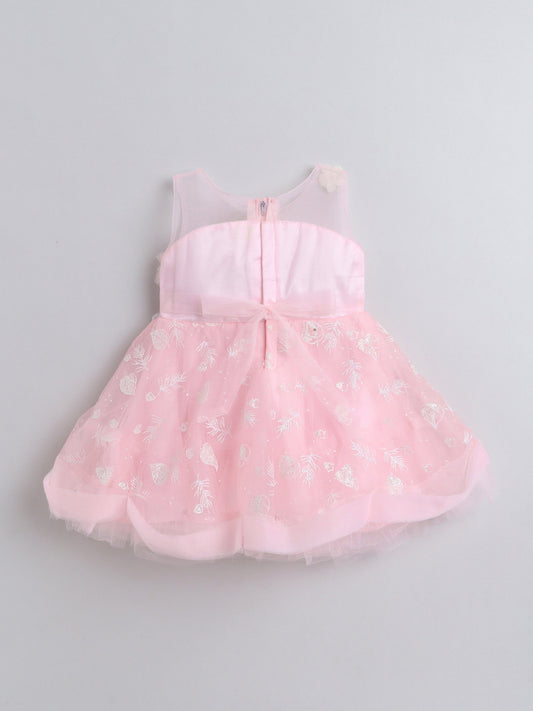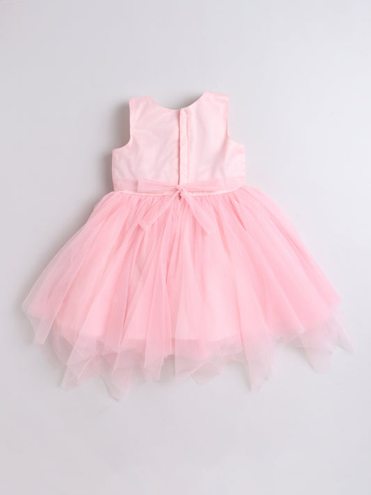 Sleeveless Floral Embroidered & Corsage Layered Net Party Dress - Pink