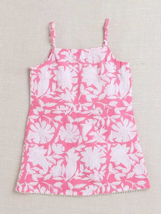 Sleeveless Floral Print Mirrow Work Lace Kurta Pyjama Set Pink