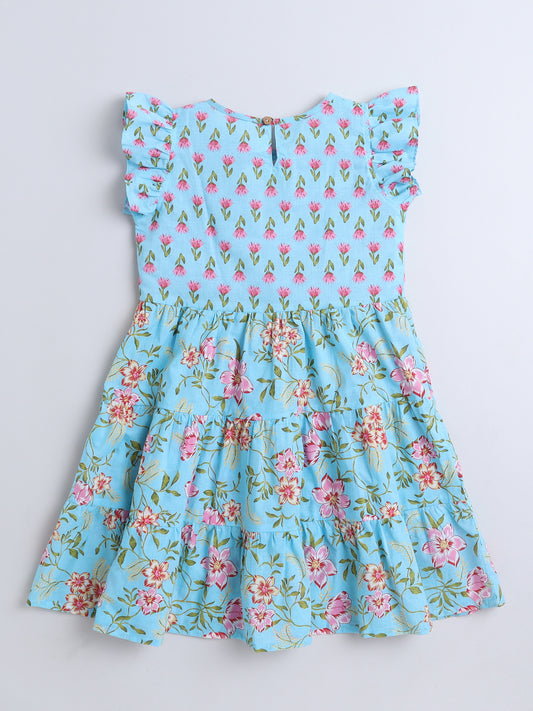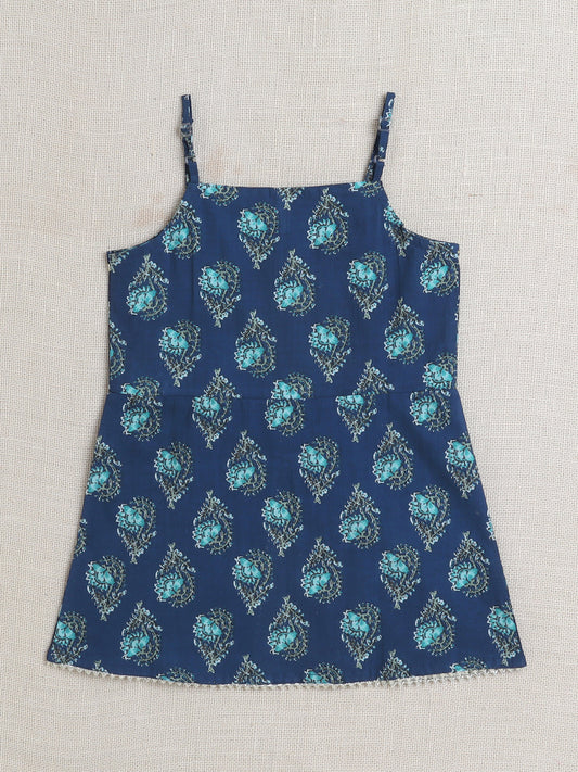 Sleeveless Floral Motif Printed Tiered Fit & Flare Cotton Dress - Navy Blue