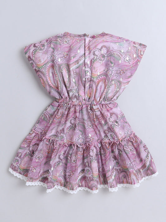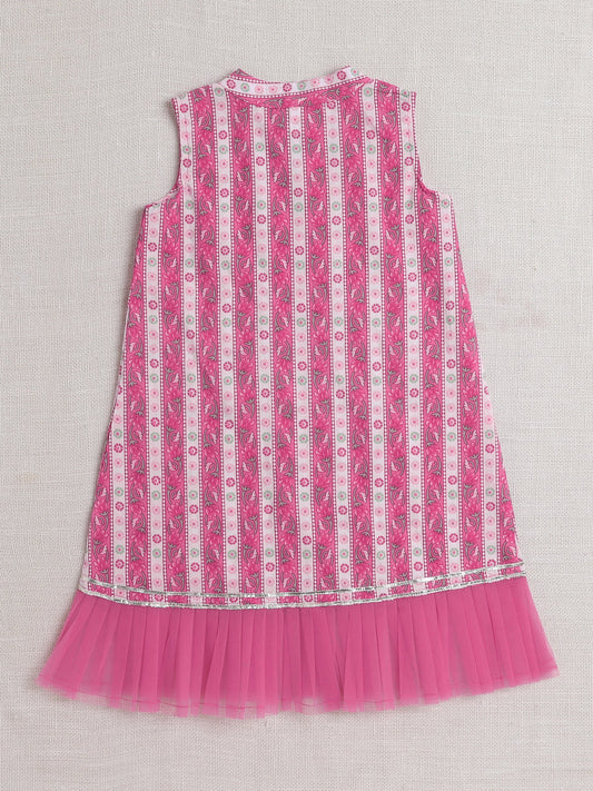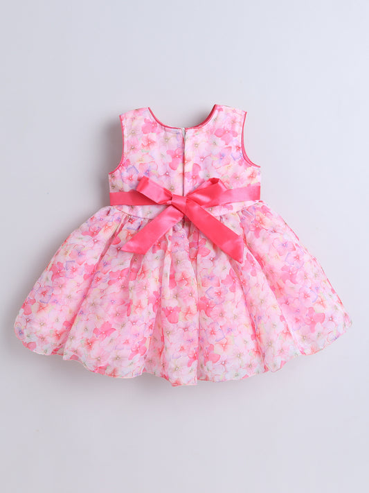 Sleeveless Floral Printed Lace Embelished Dress For Girls-Pink