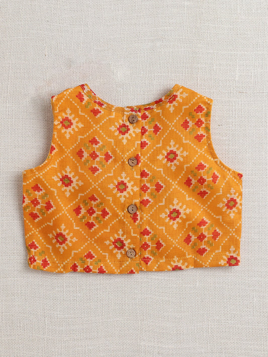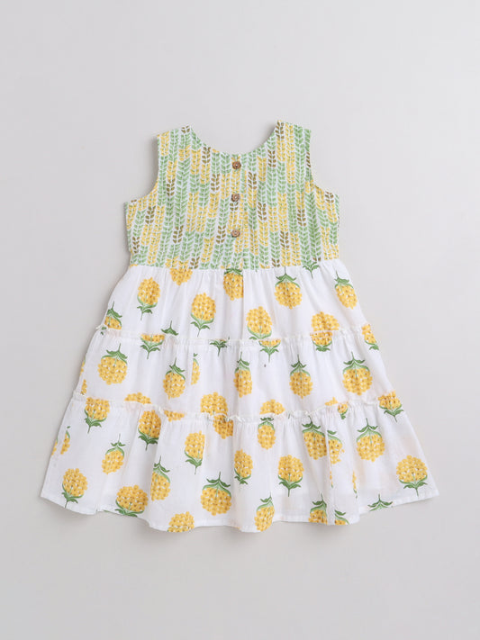 Sleeveless Floral Printed Dress For Girls -Mustard