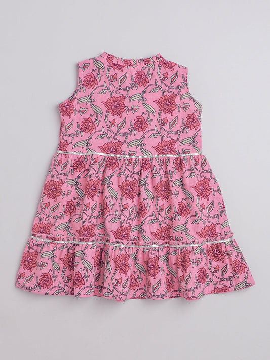 Sleeveless Floral Printed Lace Embelished Dress For Baby Girls-Pink