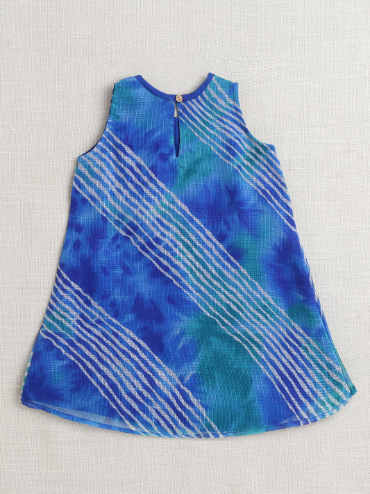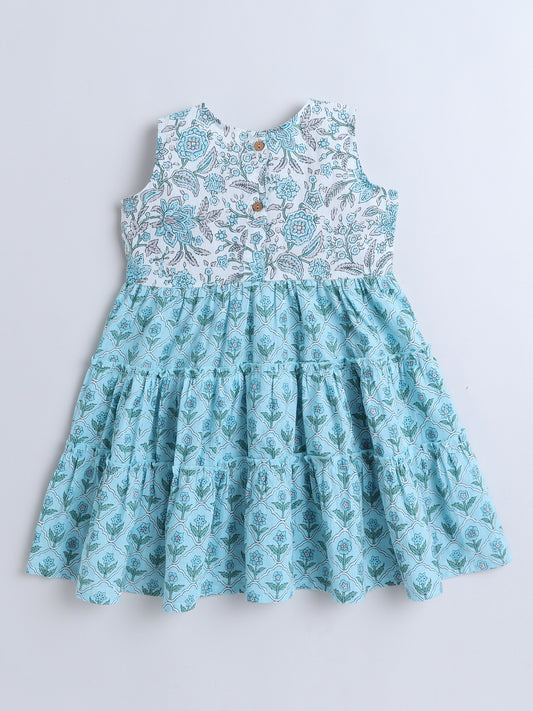 Sleeveless Floral Printed Lace Embelished Dress For Girls-Blue