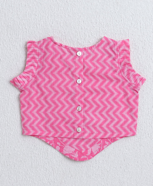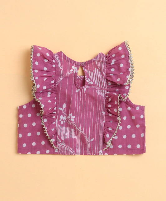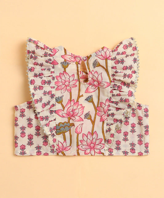 The Magic Wand Cambric Cotton Frill Sleeves AII Over Printed Lace Detailing Choli and Lehenga With Dupatta Set- Pink