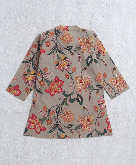 The Magic Wand Cambric Cotton Full Sleeves Floral Lace Printed Kurta Pyjama With Modi Jacket- Beige