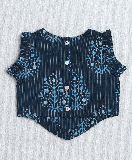 The Magic Wand Cambric Cotton Frill Sleeves Floral Printed Katha Work Top and Bottom Co-ord Set- Navy Blue
