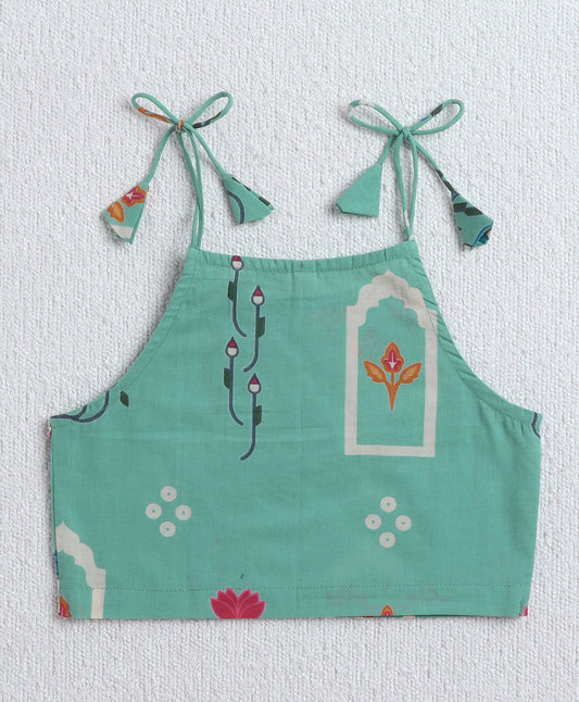 The Magic Wand Cambric Cotton Shoulder Tie up Floral Printed Lace Detailing Choli and Lehenga with Dupatta Set- Mint