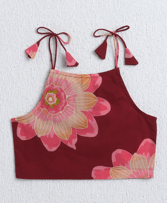 The Magic Wand Cambric Cotton Shoulder Tie up Floral Printed Lace Detailing Choli and Lehenga with Dupatta Set- Maroon