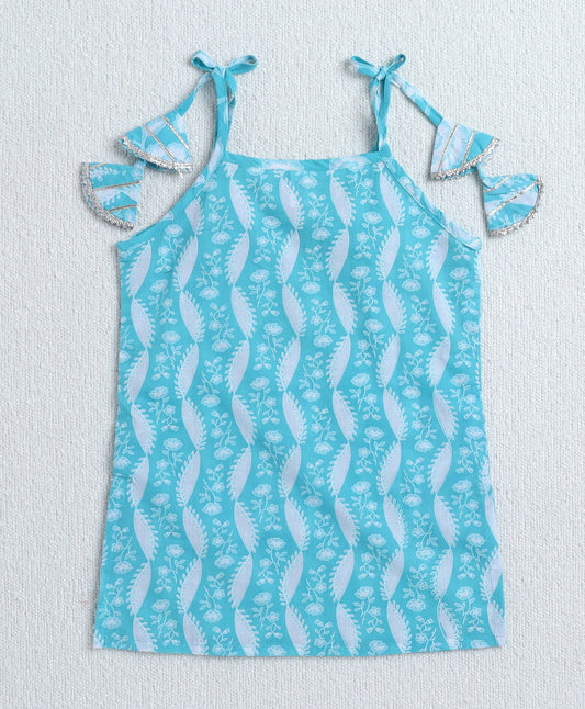 The Magic Wand Cambric Cotton Prineted Sleeveless waistcoat Top and Bottom Set- Teal Blue