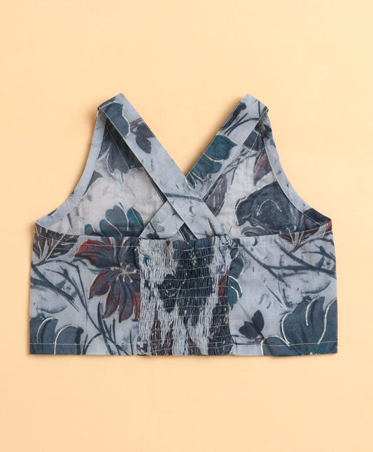 The Magic Wand Cambric Cotton Sleeveless Floral Printed Lace Detailing Frill Choli and Lehenga Set- Blue
