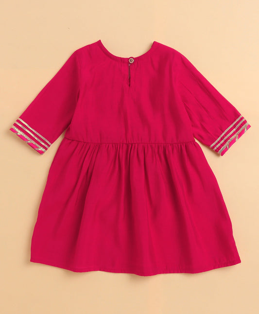 The Magic Wand Cambric Cotton Three Fourth Sleeves Solid Gota Lace Kurta and Bottom Set- Fuchisa