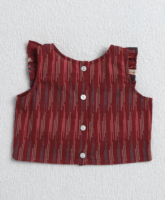 The Magic Wand Cambric Cotton Sleeveless Floral Printed Frill Choli and Lehenga Set- Maroon