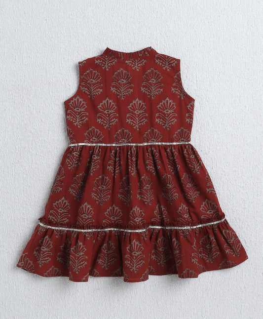 The Magic Wand Cambric Cotton Sleeveless Floral Printed Pleated Kurta & Ballon Pant Set- Maroon