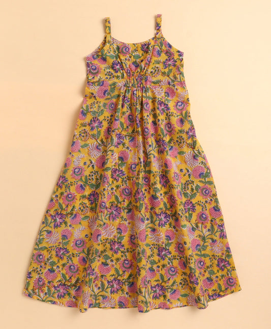 The Magic Wand Cotton woven Cambric Hand Block Printed Spagetti Long Dress with Dupatta- Yellow