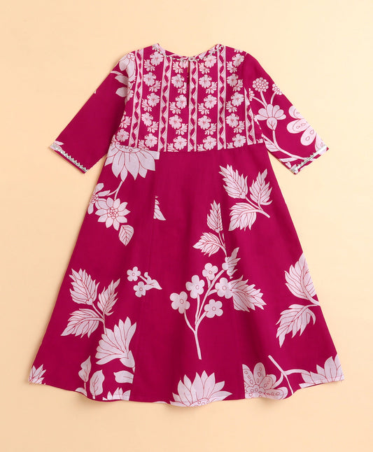 The Magic Wand Cotton Woven Floral Printed Three Fourth Sleeves Kurti Salwar and Dupatta Set- Fuchisa