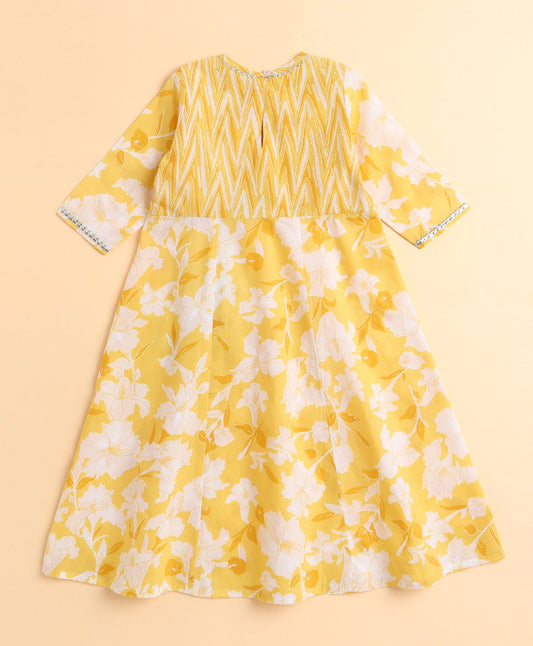 The Magic Wand Cotton Woven Floral Printed Three Fourth Sleeves Kurti Salwar and Dupatta Set- Yellow