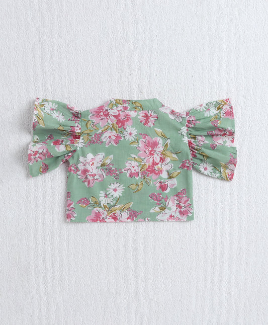 The Magic Wand Cotton Woven Ruffle Sleeves Floral Printed Top and Pant with Patch Pocket Set- Mint