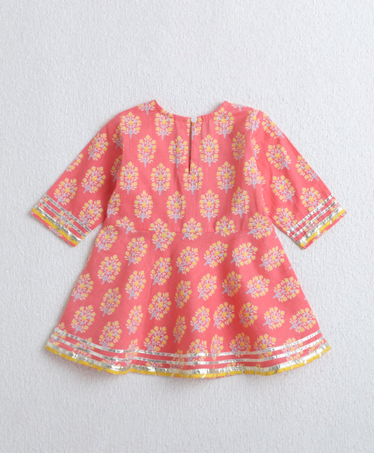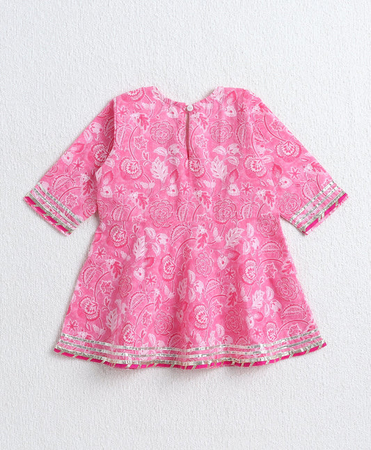 The Magic Wand Cotton Woven Three Fourth Sleeves Floral Printed Kurti with Bottom Set- Pink