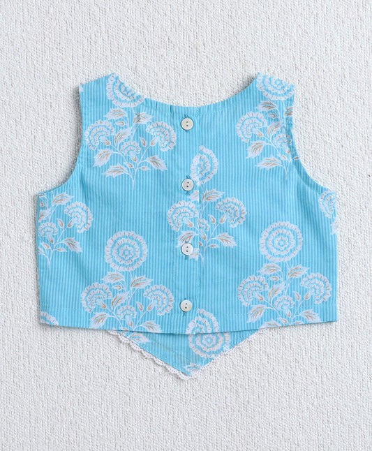 The Magic Wand Cotton Woven Sleveless Floral printed Lace Detailed Choli & Lehenga Set with Dupatta- Blue