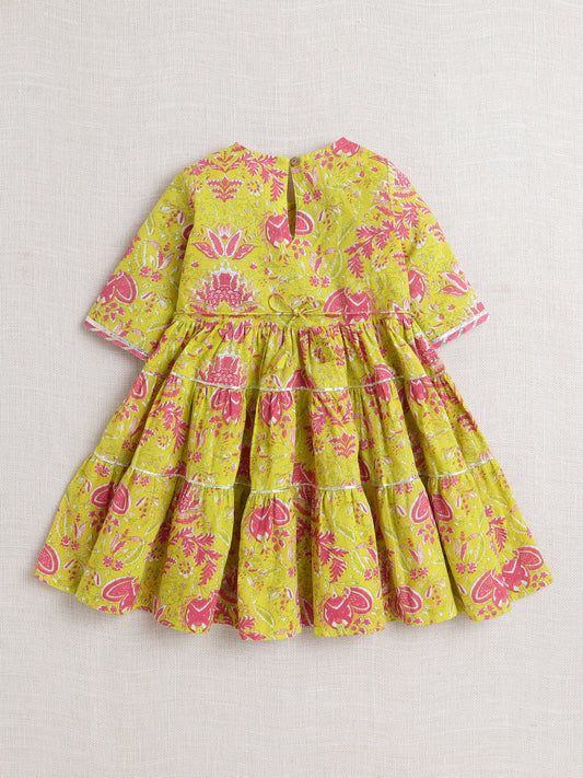 The Magic Wand Printed Short Sleeves Gora Lace & Tassle Detailing Tiered Gota Dress For Girls