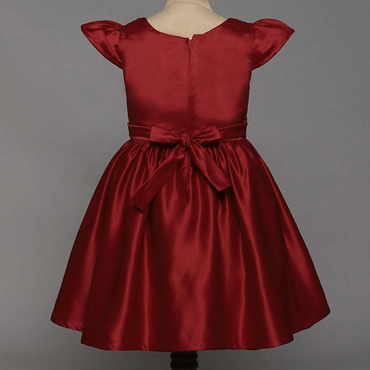 The Magic Wand Solid Satin Cap Sleeves Flower Embelished Party Dress For Girls With Bow Maroon