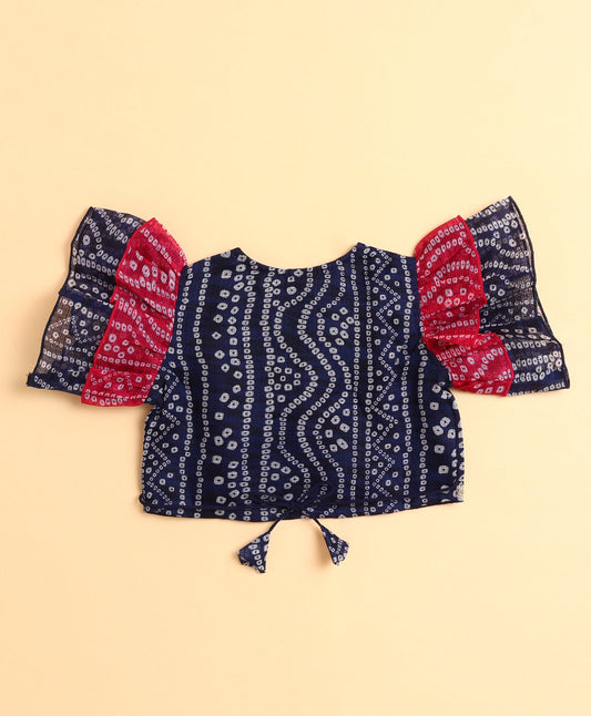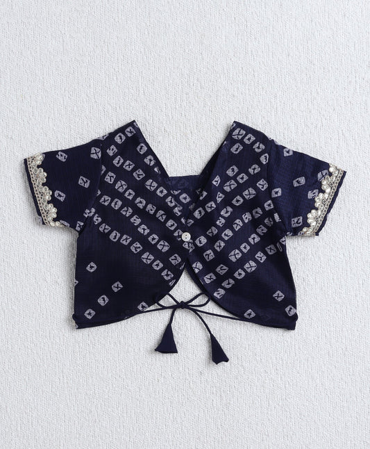 The Magic Wand Woven Elbow Sleeves Bandhani Printed Top with Foil Lehenga Set- Navy Blue