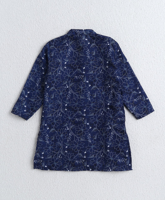 The Magic Wand Woven Full Sleeves Floral Digital Printed Kurta & Pyjama Set- Navy Blue