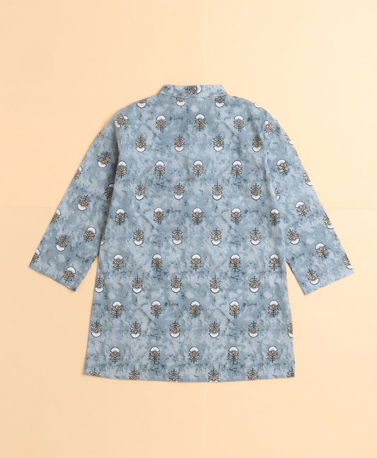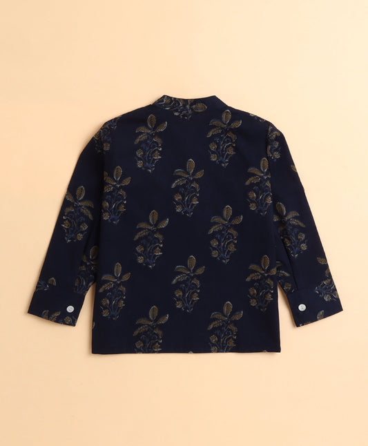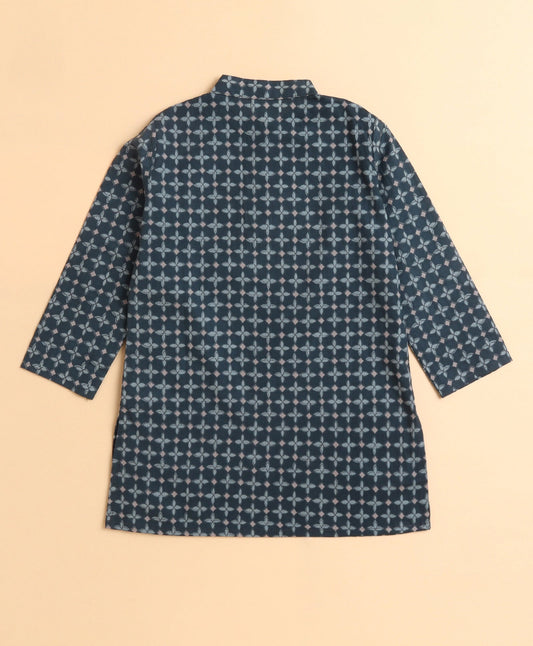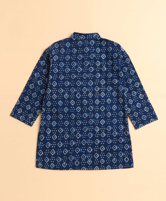 Cotton Leaf Printed Full Sleeves Short Kurta-Navy Blue