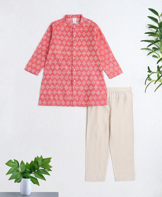 Cotton Woven Full Sleeves Foil Printed Kurta and Pyjama Set- Pink