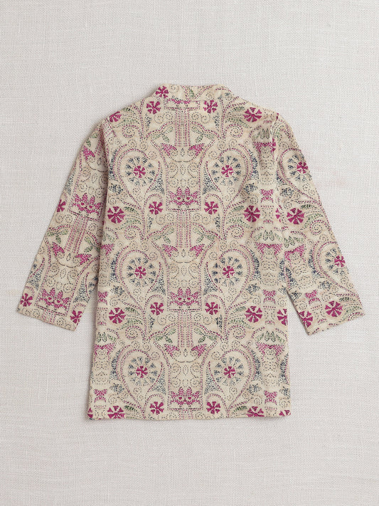 Full Sleeves Floral Print Kurta set with Jacket- Pink