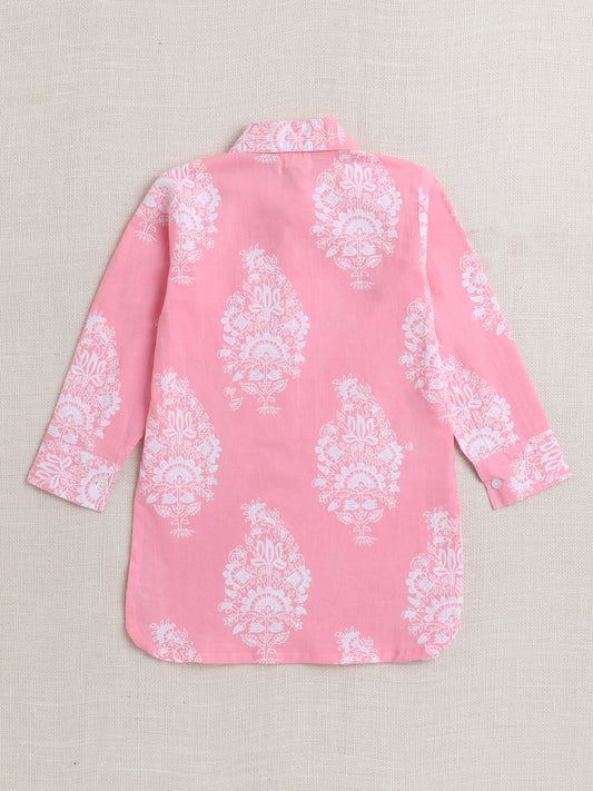 Cotton Full Sleeves Floral Printed Kurta With Pyjama Set - Pink