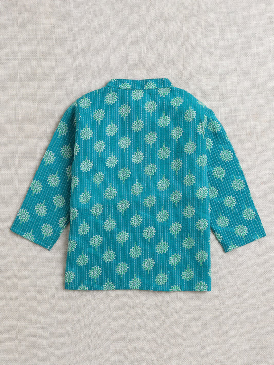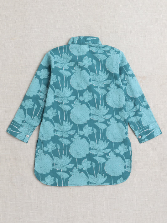 Cotton Full Sleeves Floral Printed Kurta With Pyjama Set - Teal Blue
