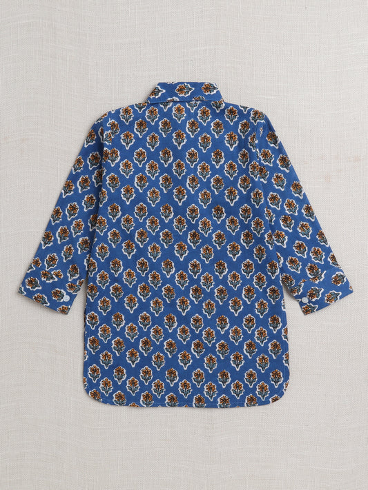 Cotton Full Sleeves Floral Printed Kurta & Pyjama Set - Blue