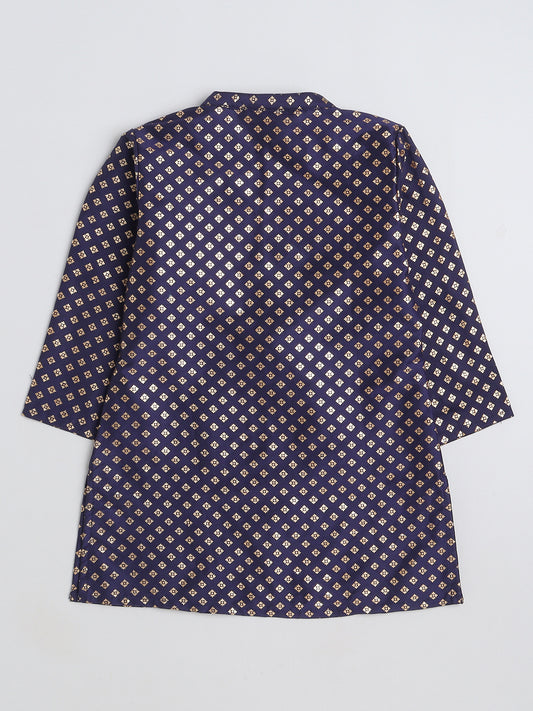 Full Sleeves Foil Printed Golden Piping Placket Kurta & Pyjama Set For Boys-Navy