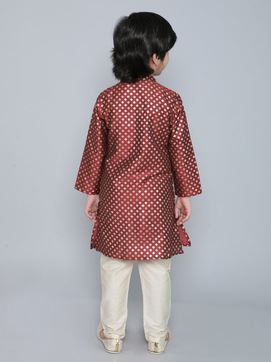 Full Sleeves Foil Printed Golden Piping Placket Kurta & Pyjama Set -Maroon