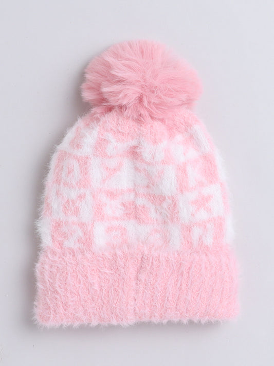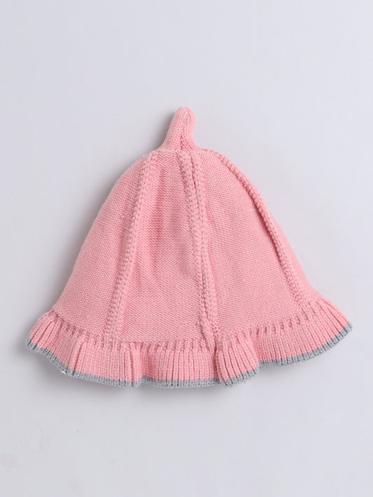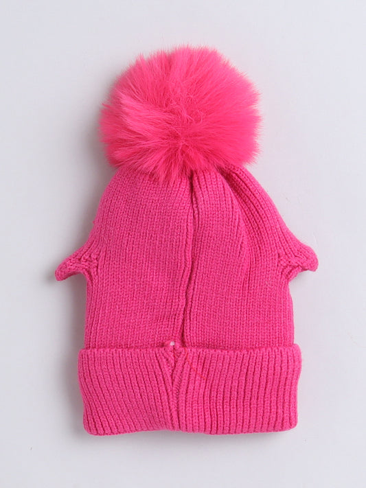 Kids Woolen Cute Penguin Design Cap With Pom Pom- Pink