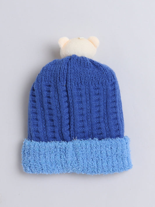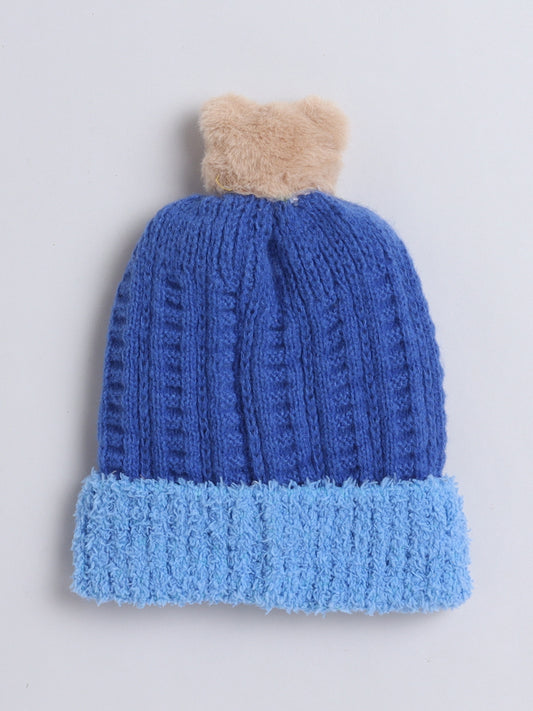 Kids Woolen Cute Bear Face Applique Cap - Blue