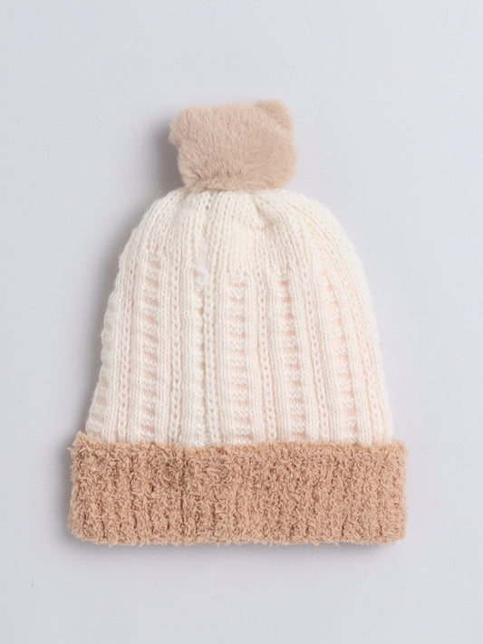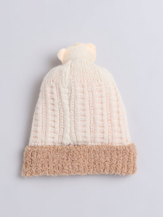 Kids Woolen Cute Bear Face Applique Cap Off - White