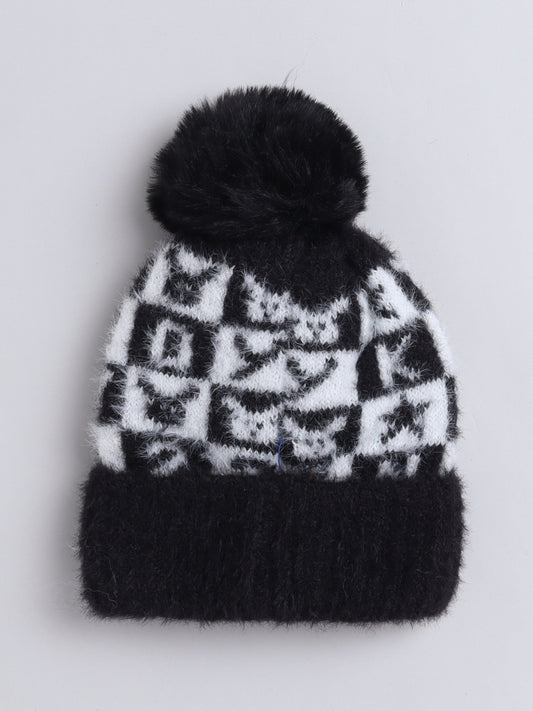 Kids Cute Alphabet Design Woolen Cap With Pom Pom - Black