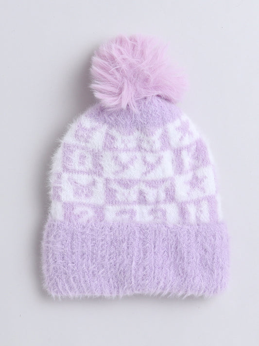 Kids Woolen Cute Alphabet Design Cap With Pom Pom - Purple