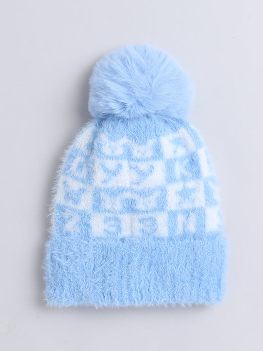 Kids Woolen Cute Alphabet Design Cap With Pom Pom - Blue